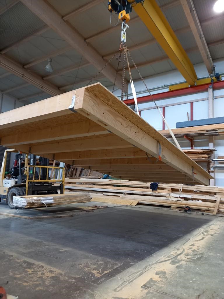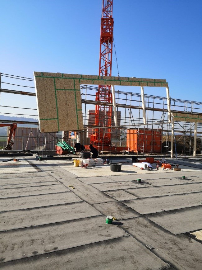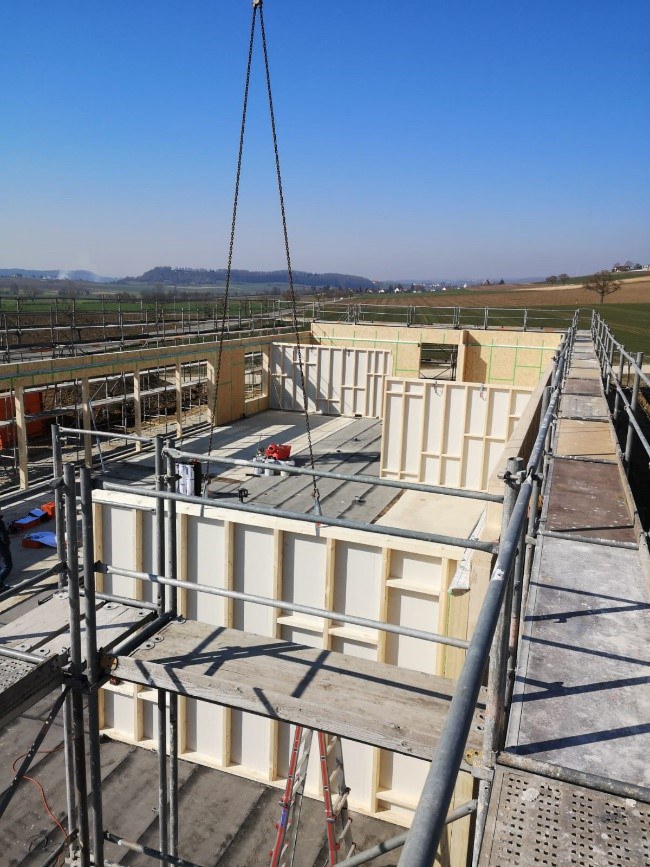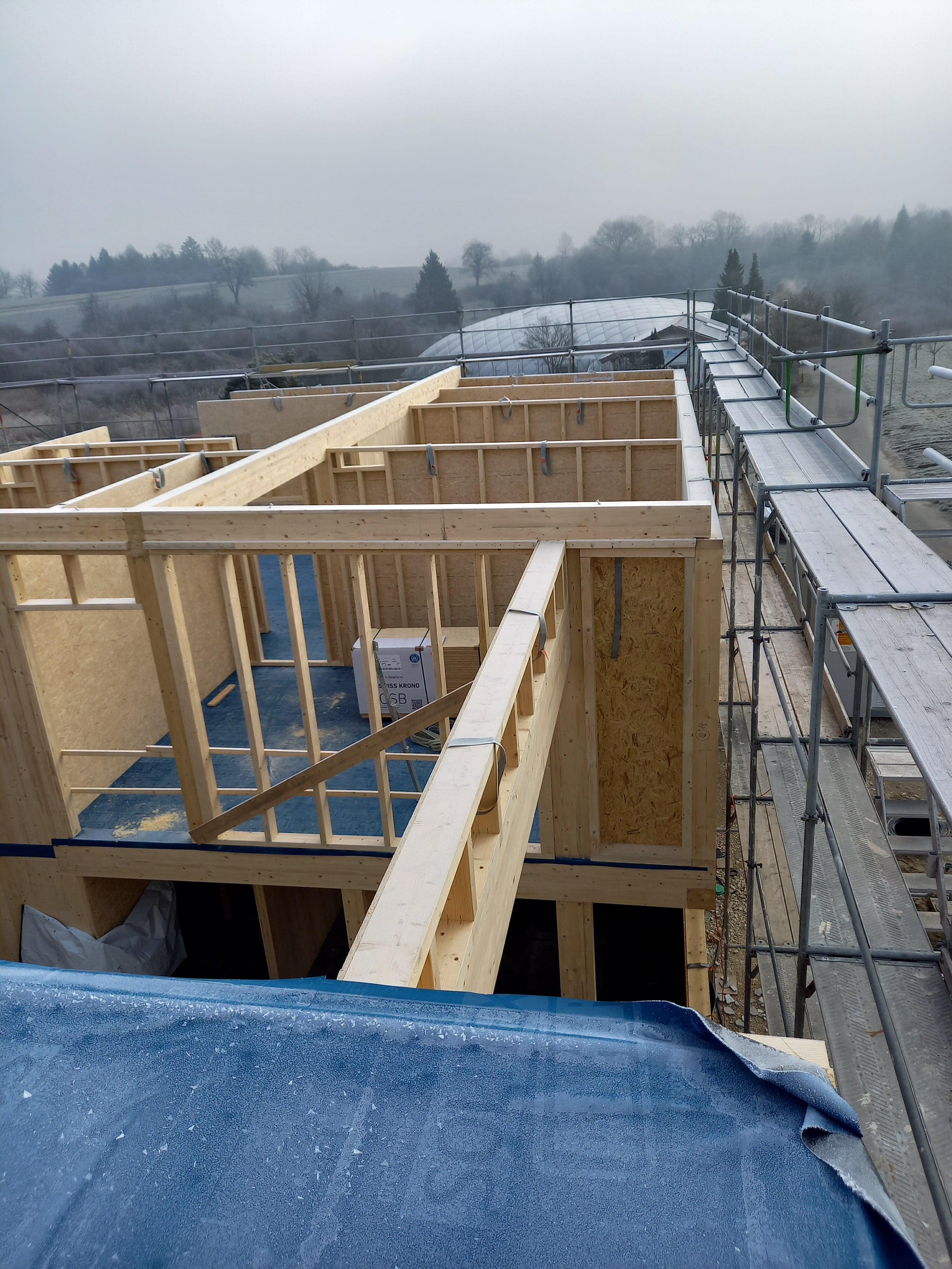 in Holzbauweise, mit eigener Produktion der vorgefertigten Ständerwände und Decken