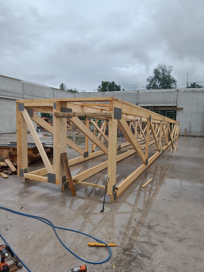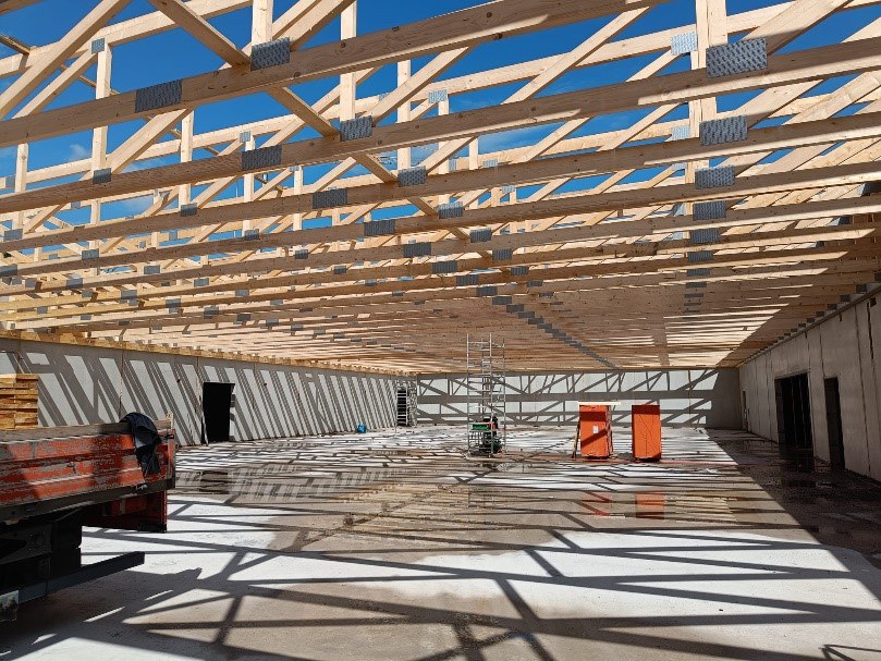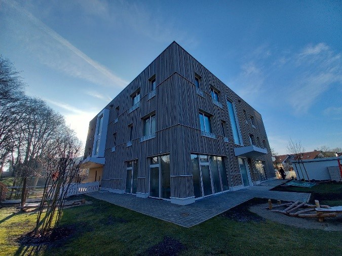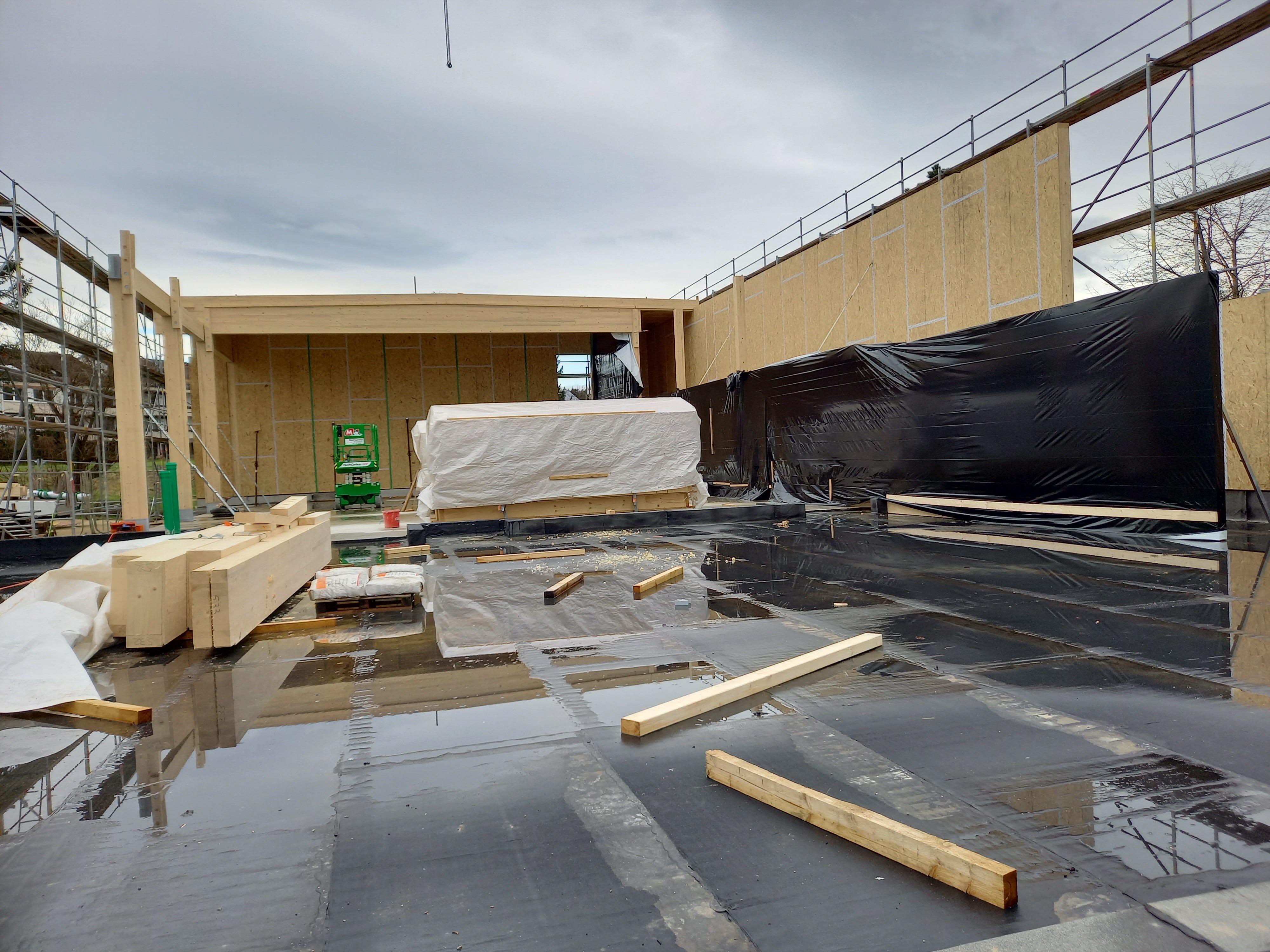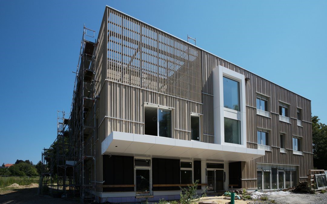 in Holzbauweise, mit eigener Produktion der vorgefertigten Ständerwände und Decken