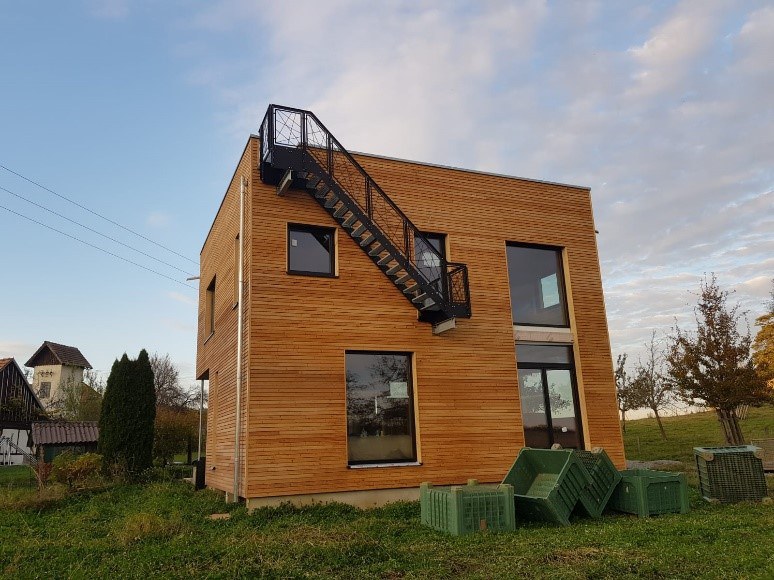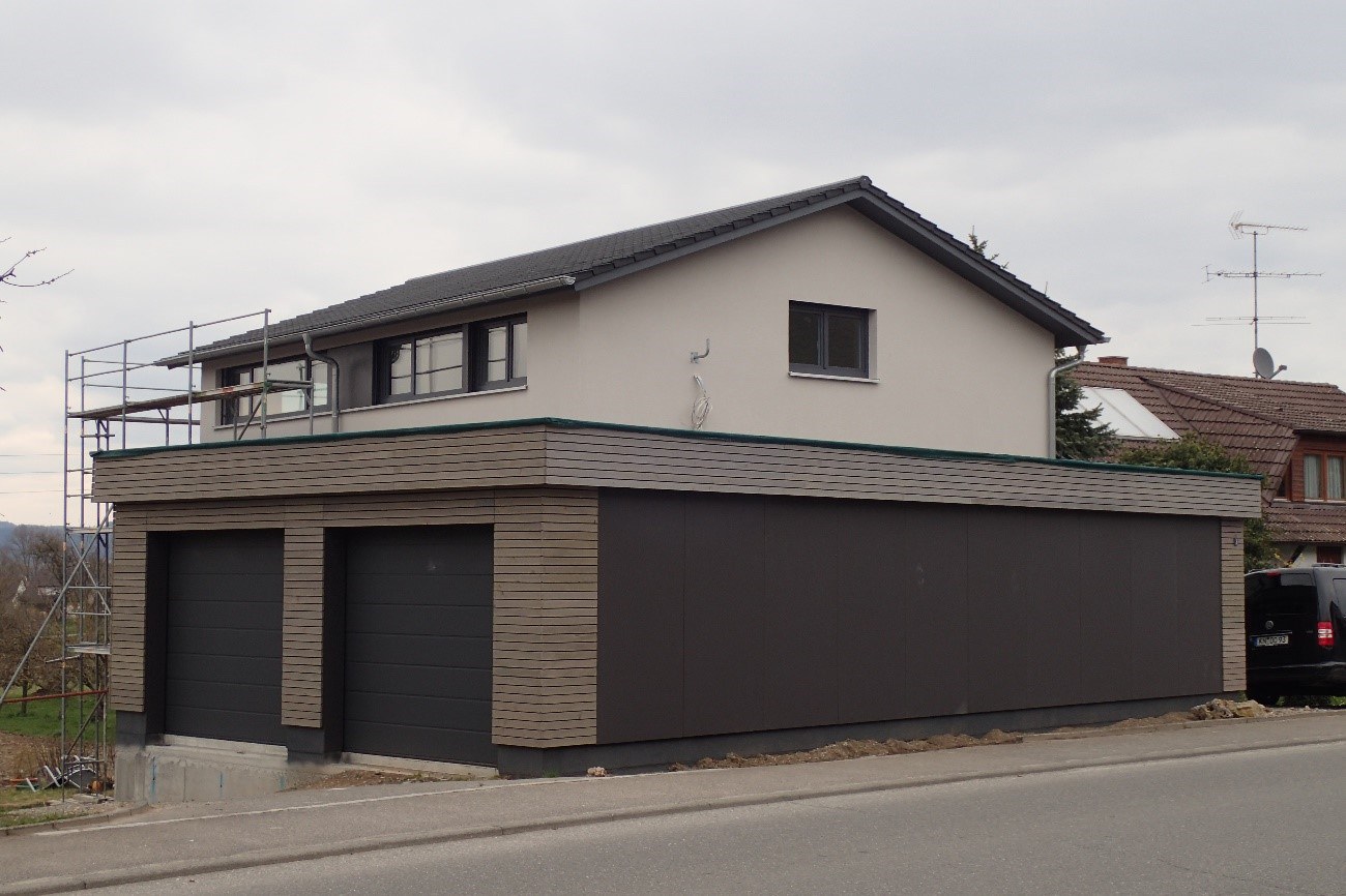 Außenwände in Holzbauweise (Holz-Beton-Skelettbauweise) in eigener Produktion, Außenfassade